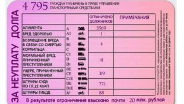 Как сообщает Пресс-служба УФССП России по Самарской области, в 2017 году за неуплату долга было ограничено на право управления автомобилями около 4,8 тысяч должников, из которых более 3,5 тысяч не платили своим детям алименты. Кроме этого, запретили садиться за руль около 770 должникам по штрафам суда по административным штрафам за нарушение ПДД и почти 100 за штрафы ГИБДД. Около 320 должников, которые не возместили ущерб, причиненный преступлением, более 40 должников, которые не компенсировали моральный вред, также не смогут управлять машинами. Законом предусмотрен порог в десять тысяч рублей, как и на ограничение права на выезд за границу нашей страны. Причем это ограничение касается не только автотранспорта, но и воздушных судов, судов морского, внутреннего водного транспорта, мотоциклов, мопедов и легких квадрициклов, трициклов и квадрициклов, самоходных машин.