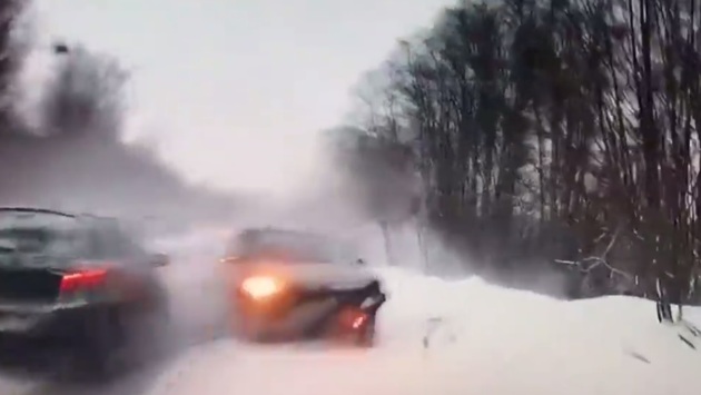 Водитель легковушки следовал по обледеневшей трассе и не справился с управлением. Машина вылетела на встречку, где столкнулась с другим авто. Аварию запечатлел видеорегистратор ещё одного автолюбителя. По его словам, ДТП обошлось без жертв.