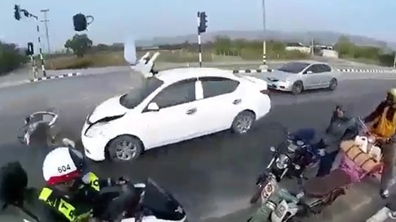 В сети размещены кадры страшного ДТП, едва не унесшего жизнь 23-летней женщины в Таиланде. Инцидент, произошедший 5 февраля, попал в объектив камеры очевидца. Медсестра, работающая в отделении реанимации местной клиники, отправилась в больницу на своем мопеде. В тот момент, когда она остановилась перед перекрестком в ожидании включения разрешающего сигнала светофора, в нее на большой скорости врезался легковой автомобиль. От удара женщину отбросило в сторону, головой она почти пробила лобовое стекло легковушки, после чего с нее слетел шлем. Сотрудники скорой помощи доставили пострадавшую в больницу. Как сообщается, в настоящее время ее жизни ничего не угрожает. Предполагаемый виновник аварии рассказал, что видел красный свет и пытался остановиться, однако у его транспортного средства отказали тормоза. Полиция проверяет слова водителя.