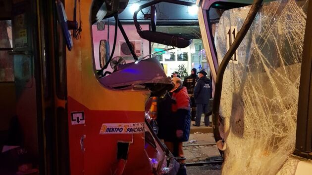 В Краснодаре произошло лобовое столкновение автобуса с трамваем