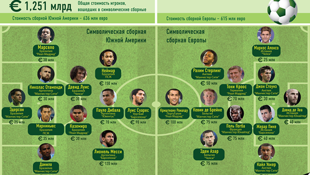 Sputnik составил две символические сборные ЧМ-2018 из самых дорогих футболистов Южной Америки и Европы.
