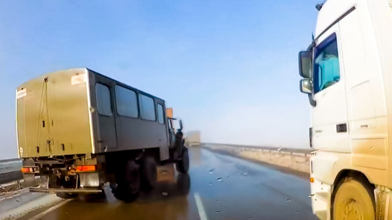 Сначала водитель совершил неожиданный обгон, а затем "организовал" слалом на скользкой дороге. Но он явно не ожидал, что перед ним окажется сразу несколько фур по обе стороны дороги. В итоге он маневрировал на высокой скорости, чтобы не сбить изумленных водителей или врезаться в припаркованные машины.