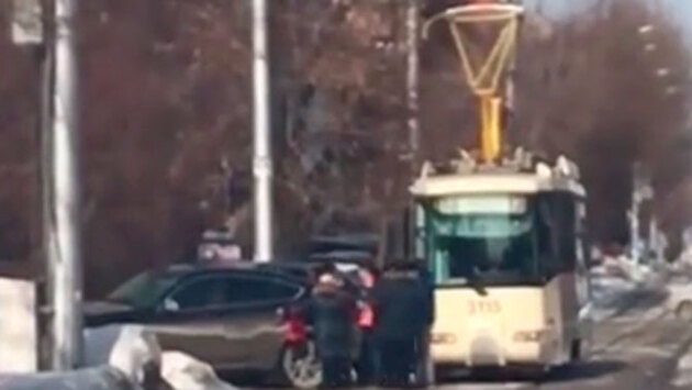 Пассажиры трамвая в Новосибирске вытолкали запаркованный на путях джип: видео