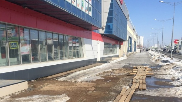 Тротуар около ТЦ «Нота» затопило из-за прорыва брошенного водопровода