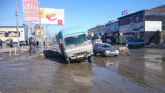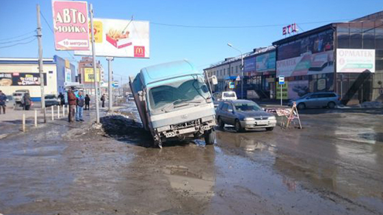 Недалеко от поста ГИБДД по улице Первомайской в Бердске грузовик ушел задним колесом под землю, сообщает «АвтоБердск». Водитель вез продукты питания из Искитима в детские сады. «Теперь кран надо заказывать, чтобы вытащить машину, – рассказал водитель. – Да еще неизвестно, что там под землей повреждено». Хозяин грузовика вызвал на место происшествия сотрудников ГИБДД. Состояние дороги на улице Первомайской в Бердске давно беспокоит местных жителей. Еще год назад на этой улице провалилась дорога. «Случилось все из-за дефекта на водопроводе – там произошел залом трубы», – рассказал корреспонденту VN.ru начальник управления ЖКХ администрации города Владимир Захаров. Однако после ремонта труб дороги реконструировать не стали. «Дело в том, что в этом году на Первомайской проведут работы в рамках перекладки коллектора постфекальной канализации. Там будет производиться разрытие, потому просто нет смысла сейчас класть асфальт – это будет бесполезной тратой денег», - сказал Владимир Захаров.