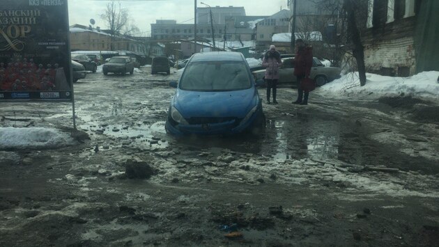 В Пензе в самом центре города, на улице Суворова, очевидцы сообщают об утонувшей в луже иномарке. Можно сказать, что произошла весенняя авария из-за плохого состояния дороги. Снимки с места происшествия пензенцы выложили в группу «Пенза live» соцсети «ВКонтакте». На фотографиях запечатлено, как иномарка Peugeot не смогла преодолеть гигантскую яму, затопленную водой. Из-за такого неудачного маневра у автомобиля отвалился бампер, а автовладельцу потребовалась помощь, чтобы извлечь машину.