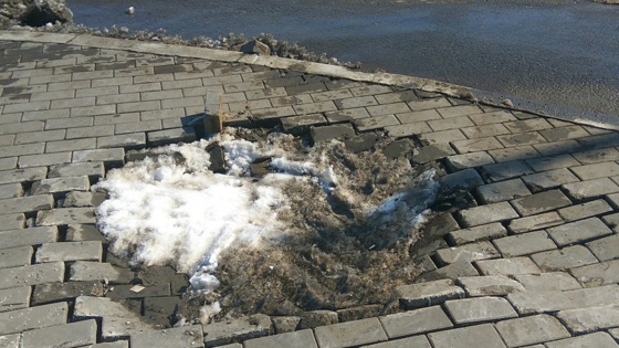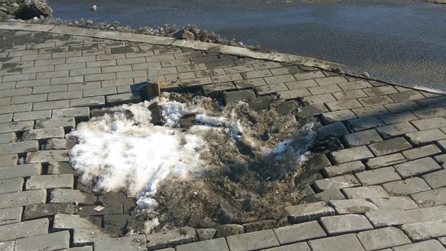 Пообедали «дорожные черви»: на тротуарах Мехзавода провалилась плитка
