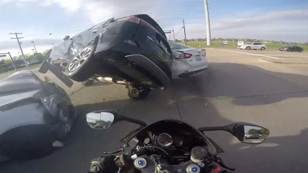 Нашлемная камера байкера запечатлела момент аварии, полноценным участником которой, к счастью для него, он так и не стал. Житель города Плейно, штат Техас, на днях ехал по делам на своем мотоцикле. После включения зеленого сигнала светофора, он, как и другие участники движения, тронулся с места. Через несколько мгновения в автомобиль прямо перед ним на большой скорости врезалась машина, водитель которой по какой-то причине решил проскочить перекресток на красный. От удара протараненное авто опрокинулось на бок, а сам автор видео врезался в поврежденное транспортное средство и упал на землю. Мужчина избежал серьезных травм и рассказал, что что считает себя "настоящим счастливчиком".
