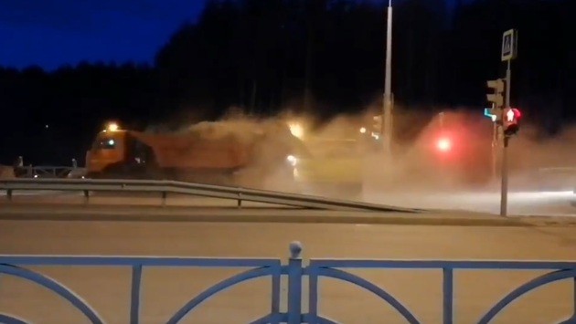 На Краснолесья коммунальщики убрали пыль с дороги на припаркованные автомобили