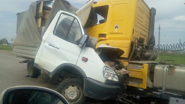 Очевидцы происшествия утверждают, что один из водителей серьезно пострадал. ДТП зарегистрировано около 11:30 в среду 16 мая у села Орловское Марксовского района. Здесь не поделили дорогу ГАЗель и бензовоз, которые столкнулись лоб в лоб. По предварительной информации, тентованная ГАЗель вылетела на встречную полосу, где столкнулась с ехавшим навстречу грузовиком. Столкновение было такой силы, что кабина ГАЗели оказалась полностью подмятой фурой с логотипом компании «ТНК». На месте работают сотрудники областной ГИБДД. Информация о пострадавших уточняется. Фото: Новости Саратова