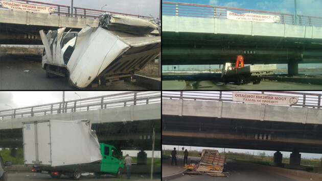 Плакат «Газель не пройдёт», размещённый на так называемом «мосту глупости» в Санкт-Петербурге, не останавливает водителей грузовиков. День города путепровод высотой 2,7 метра «отметил» юбилейной аварией с участием «газели». По данным пользователей соцсетей, под мостом застрял уже 150-й автомобиль.