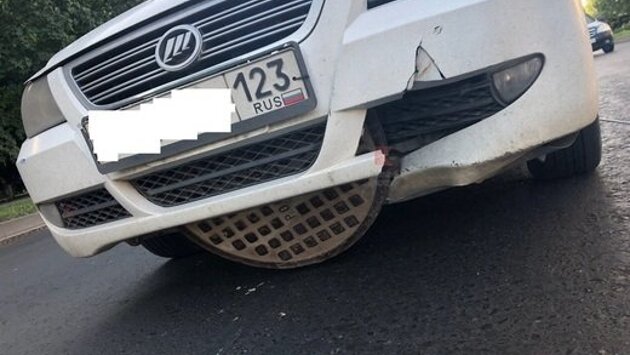 Необычное ДТП в Краснодаре - "Лифан" поймал люк под бампер и не отпускает