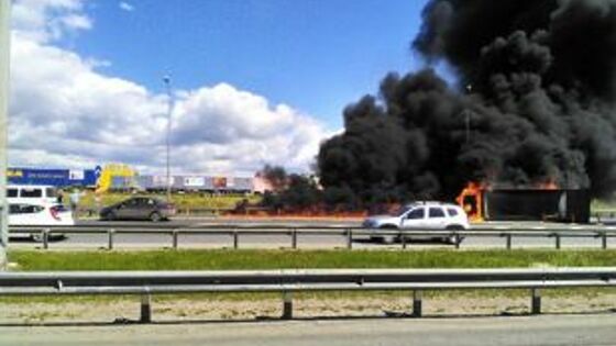 В Санкт-Петербурге на КАД перевернулся и вспыхнул грузовик