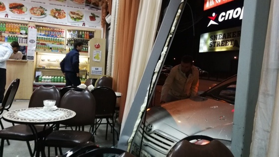 В ночь с 14 на 15 июня на парковке возле ТЦ «Колизей Cinema» произошла авария. Автомобиль Toyota Avensis врезался в павильон кафе восточной кухни «Дубай». По словам очевидцев, ДТП случилось около полуночи. Стоявшая на парковке иномарка переехала бордюр и врезалась в стену павильона. Машина пробила стекло и заехала капотом в помещение кафе. — Люди вышли из кинотеатра и включили автозапуск, — рассказала 59.ru сотрудница пострадавшего кафе. — Машина вдруг поехала и врезалась в стену. В результате инцидента никто из посетителей и персонала кафе не пострадал. Сейчас заведение работает, из дверей убрали разбитое стекло, а вход прикрыли шторой. Очевидцы в соцсетях шутят над произошедшей аварией: «Ты не ты, когда голоден», «Без мам, пап и кредитов съездил в Дубай», «Зато шаверма без очереди». О ДТП сейчас напоминает сломанная дверь Ранее мы писали, что в центре Перми опрокинулся КАМАЗ, груженный песком.