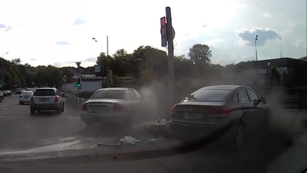 Регистратор запечатлел момент столкновения легковушек, произошедшего в пятницу, 22 июня, на пересечении набережной Ганнушкина, проспекта Ветеранов и улицы Богородский Вал в Москве. Судя по кадрам видео, водитель автомобиля Hyundai Sonata выехал на перекресток на запрещающий сигнал светофора. После этого он протаранил другой Hyundai, разбросал по улице содержимое дополнительного багажника, установленного на крыше, и вылетел за пределы проезжей части, где снес секцию ограждения, едва не упав в воды Яузы. О пострадавших в ДТП пока не сообщалось.