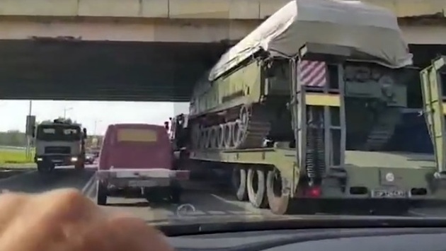 Появилось видео, снятое на месте ДТП с участием военного грузовика на улице А. Невского. Ролик "Клопс" предоставил очевидец. Вечером в среду, 27 июня, под мостом на Невского застрял военный грузовик, который перевозил танк. Он двигался в сторону Приморского кольца. ДТП затруднило движение транспорта.