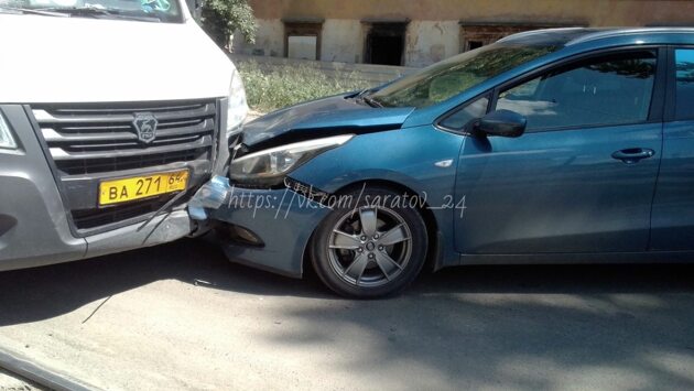 Автобус перевозил людей, когда попал в ДТП. Авария произошла днем 28 июня в Заводском районе на пересечении улиц Огородная и Большого динамовского проезда. Дорогу не поделили микроавтобус, следовавший по маршруту № 16 и автомобиль KIA. Очевидцы происшествия сообщили в соцсети «ВКонтакте» в группе «Саратов онлайн», что водитель маршрутки якобы решил объехать яму по встречной полосе, где врезался в иномарку. Ехавшая в злополучном автобусе Анастасия Волкова написала в соцсетях, что, к счастью, никто не пострадал, если не считать того, что все вышли из салона «маршрутки» с красными лбами. Фото: соцсети