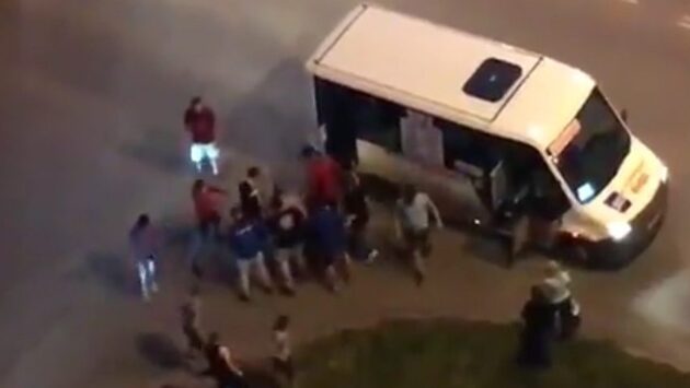 В социальных сетях появилось видео массовой драки омских подростков, произошедшей минувшей ночью на улице 24-я Северная. Как пишет «Омск Здесь» со ссылкой на очевидцев ЧП, группа молодых людей гналась по улице за тремя 16-летними подростками. Убегавшие, увидев стоящую на дороге маршрутку, кинулись к ней и попросили водителя открыть дверь, который сделал это не сразу. Толпа, состоящая, по разным данным, из 10-20 человек подбежала к автомобилю и начала выламывать двери, после этого подростков вытащили из маршрутки и начали прилюдно избивать. Фото: vk.com/chp55 - Они начали выламывать двери, проникли внутрь, их обрызгали перцовым баллончиком. После того, как проветрило, вытащили 3-х, и началось избиение, им прыгали ногами по голове, после чего разбежались..., - сообщают подписчики паблика «ЧП Омск» в соцсети «ВКонтакте». Несовершеннолетние просили помощи у прохожих, кричали: «Спасите!», однако, на помощь никто не пришел. Омичи лишь криками пытались отогнать разъяренную толпу от подростков. Что стало причиной конфликта - неизвестно. В пресс-службе УМВД России по Омской области сообщили, что информации о происшествии у них на данный момент нет.