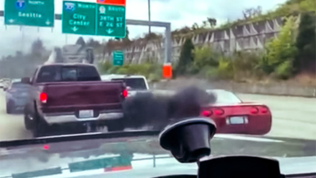 Это чудесное видео было снято на видеорегистратор недалеко от Сиэтла на многополосной трассе. Водитель красного спорткара начал соперничать со здоровенным пикапом Dodge за полосу, не желая пускать того впереди себя. В какой-то момент пикап оказался впереди на соседней полосе, а владелец Chevrolet Corvette приоткрыл окно, начав жестикулировать и, очевидно, кричать что-то оппоненту. Это он сделал зря: ответом на его гнев стало огромное облако черных выхлопных газов, которое исторг из себя пикап. С учетом открытого окна несложно предположить, что водитель Corvette некоторое время ехал как в тумане, откашливаясь и проклиная тот момент, когда он вздумал тягаться с грузовичком.