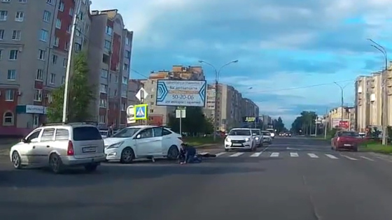 На пешеходном переходе в Великом Новгороде столкнулись велосипед и автомобиль — авария произошла вчера, 4 июля, и была записана на видео одним из очевидцев. Когда велосипедист выезжал на высокой скорости на "зебру", то не заметил движущийся по дороге автомобиль Ford. Водитель машины, в свою очередь, не ожидал вылетевший справа велосипед и успел лишь слегка отклониться в сторону. Произошло столкновение, после которого велосипедист хотя и смог самостоятельно подняться на ноги, однако при этом его изрядно шатало. Вскоре приехала бригада врачей и оказала ему первую помощь.