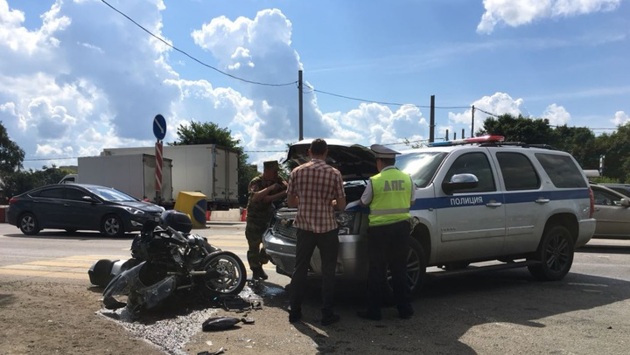 В сети размещены кадры столкновения полицейского автомобиля и мотоциклиста, произошедшего вечером в четверг, 12 июля, на Горьковском шоссе в Балашихе. В самом начале ролика видно, как внедорожник Chevrolet Tahoe в раскраске, свидетельствующей о его принадлежности к ДПС, совершил левый поворот на перекрестке. Через несколько секунд после этого в него врезался байкер, объехавший с правой стороны по обочине грузовик, остановившийся, чтобы пропустить полицейский автомобиль, двигавшийся с включенными проблесковыми маячками, но, как слышно на записи, без сирены. После столкновения мужчина, управлявший двухколесным транспортным средством, перелетал через капот джипа и упал на асфальт. По предварительным данным, пострадавший получил перелом костей таза.