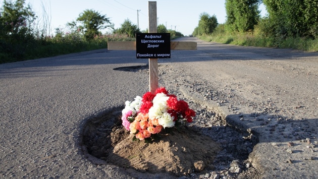 Активисты из Щеглово установили могильный крест в яме на дороге
