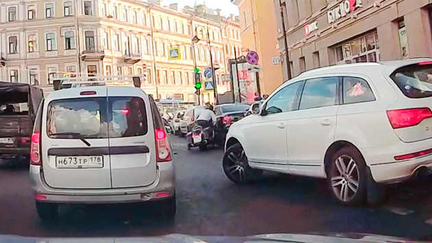 Мотоциклист, очевидно, не слишком опытный и, вдобавок, ездит на круизере, чья ширина больше стандартной. Поэтому втиснуться между машинами становится нетривиальной задачей. В результате пилот мотоцикла бьет одну машину, вторую, третью, отскакивая от них как шарик в пинболе. Теперь придется из собственного кармана оплачивать ремонт байка.