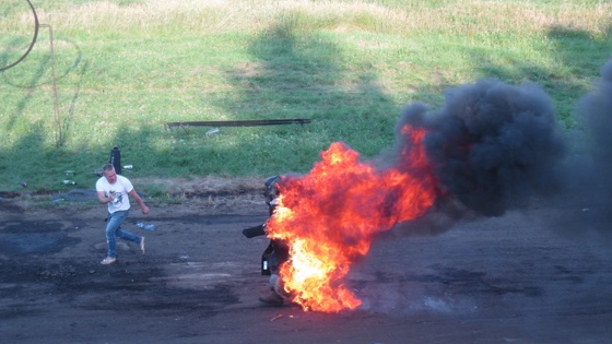 Каскадер полыхал на стадионе «Локомотив» В Ярославле в выходные показали опасное шоу. В город приехал театр каскадеров из Брянска. Шоу получилось зрелищным - машины превращались в трансформеров. Огромные автомобиль давили маленькие легковушки, как консервные банки. Машины даже летали. ДТП, только без жертв, к счастью Но участвовали не только машины. Полёт легковушки - Если психика слабая, закройте глаза! - предупреждал ведущий перед некоторыми номерами. И не зря. Чтобы удивить зрителей каскадёры даже подожгли человека. Конечно, он был в защитном костюме, но зрелище, действительно, не для слабонервных.