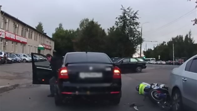 Фото видео Игоря Морозова, из группы «Подслушано автомобилистов / Владимир» социальной сети «Вконтакте Сегодня утром, без пяти минут семь, на дублере улицы Верхняя Дуброва в районе перекрестка с проспектом Ленина водитель автомобиля «Шкода Октавия» (1982 г.р.) совершил наезд на скутериста. В результате столкновения, водитель скутера упал на землю и долго-долго корчился от боли. - Водитель 1978 года рождения управлял мотоциклом «Ирбис», - пояснил «ТВ-МИГ» сотрудник отдела пропаганды УГИБДД по Владимирской области Валерьян Шируков. – Данный вид транспортного средства хоть и относится к классу скутеров, но имеет объем двигателя свыше 50 кубических сантиметров и он должен быть с номерами, а водитель – иметь удостоверение на право вождения мотоциклом категории «А». Но данный мужчина не имел право вождения мотоциклом такого класса, а сам «Ирбис» был без номеров. Водитель скутера госпитализирован – мужчина сломал ногу. А вот виновник аварии пока не установлен – он станет известен после завершения проверки. По этому поводу, кстати, в социальных сетях развернулась бурная дискуссия.