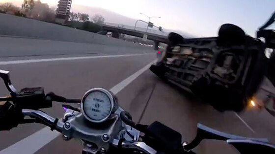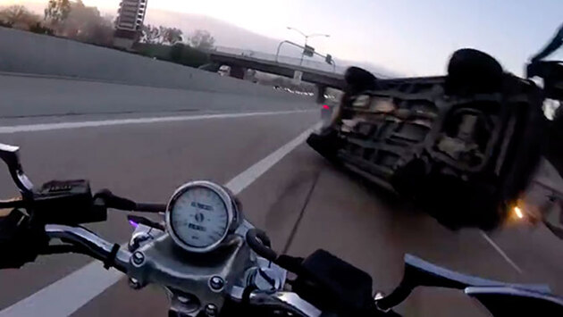 Авария с участием нескольких машин и мотоциклиста произошла в американском штате Сан-Диего. Ужасающий момент ДТП оказался запечатлен на камеру, установленную на шлеме мотоцикла, когда внедорожник, после столкновения с другой машиной, влетел в прямо в байкера. Автокатастрофа произошла на магистрали в Сан-Диего 7 февраля, однако мотоциклист обнародовал видео только сейчас, пишет Daily Mail. На кадрах видно, что после удара о мотоцикл внедорожник перевернулся и проехал еще несколько метро на крыше, сам байкер сделал сальто и приземлился на асфальт. По словам мотоциклиста, в результате аварии он получил переломы двух позвонков, и вывихи лодыжки и плечевого сустава.