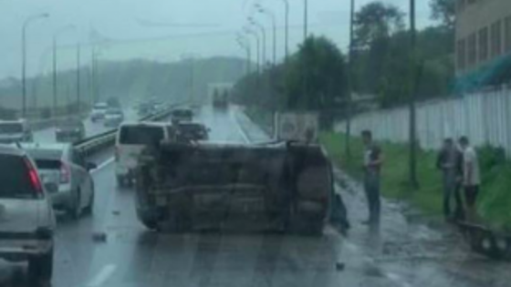 Во Владивостоке водитель такси перевернулся на мокрой дороге