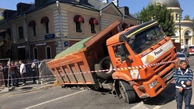 На одной из центральных улиц Москвы грузовик провалился в яму. Об этом сообщает официальная Twitter-страница столичного Центра организации дорожного движения.
