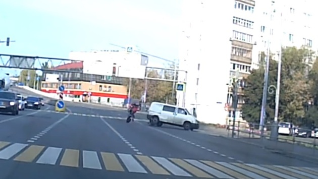 Авария с участием байкера произошла в минувшую субботу, 1 сентября, на пересечении улиц Клинской и Фестивальной в Северном административном округе столицы. Водитель микроавтобуса Volkswagen совершил левый поворот. В тот момент, когда он пересекал проезжую часть, в кадре появился мотоциклист, попытавшийся экстренно сбросить скорость перед препятствием, появившимся у него на пути. Байкер резко затормозил и полетел кубарем, после чего оказался под колесом четырехколесного транспортного средства, переехавшего обладателя мотоцикла. По предварительным данным, мотоциклист остался жив и был госпитализирован в лечебное учреждение.
