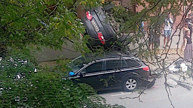 В центре Ростова машина рухнула на крышу другому авто: есть раненые