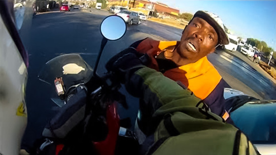 Этот захватывающий экшен был снят в Южной Африке. Автомобиль с белым водителем, мужчиной почтенных лет, остановился на перекрестке, когда внезапно к нему подбежал чернокожий преступник и через открытое окно выхватил из салона ноутбук. Однако рядом на перекрестке стоял мотоциклист, который отреагировал мгновенно: он поддал газу и протаранил налетчики, после чего попытался преследовать его на байке. К тому моменту опомнился сам автолюбитель и догнал вора быстрее, переехав его на своей машине. Пользователи обратили внимание, что водитель даже не поблагодарил мотоциклиста за помощь. Но позже автолюбитель появился в комментариях под роликом на YouTube и выразил благодарность, пояснив, что был в шоке в тот момент и плохо соображал. Он также рассказал, что, догоняя вора, переехал собственный ноутбук. "Храни тебя Бог", - закончил свой рассказ водитель.
