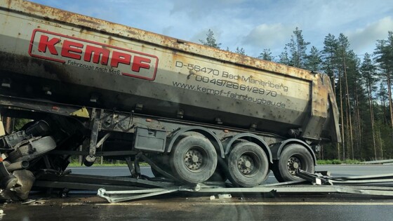 Большегруз проломил новые ограждения на "Скандинавии" и повис на них