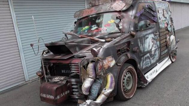 Японский тюнинг автомобиля является чем-то интересным и необыкновенным. К примеру, взгляните на модификацию автобуса Toyota Hiace в стиле Lamborghini. Но есть и такие доработки, которые выходят за границы адекватного восприятия вещей. Одной из них является автомобиль второго поколения Nissan Cube, модернизированный для выживания в постапокалептическом мире. В объявлении было указано, что машина была создана в качестве пространственной композиции для какого-то кафе. Автомобиль не предназначен для езды по дорогам общего пользования из-за низкой видимости. Дизайн автомобиля выполнен в стиле Rat Look. Кузов отличается огромным количеством декорирующих элементов. Самыми заметными из них являются трубы, торчащие из передней фары; боковины кузова, отделанные номерными знаками; царапины от огромной руки на кузове автомобиля. Придаётся машина на японском аукционе. На данный момент предлагаемая за нее цена существенно ниже заявленной.