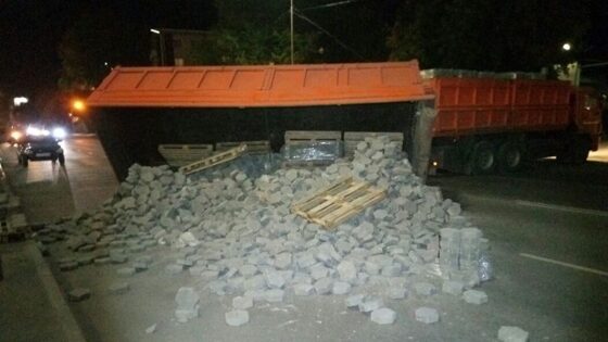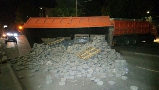 В Кургане перевернулся КАМАЗ с тротуарной плиткой