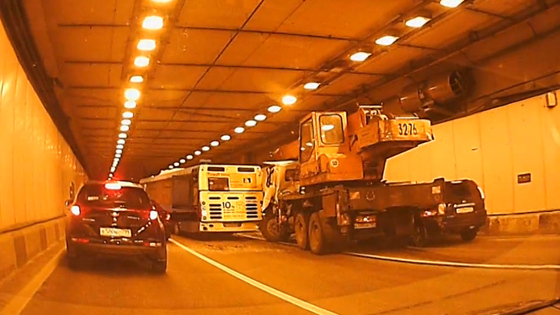 В столичном Алабяно-Балтийском тоннеле ранним утром 24 сентября столкнулись автобус, автокран и легковая машина, заблокировав две полосы движения из трех.
