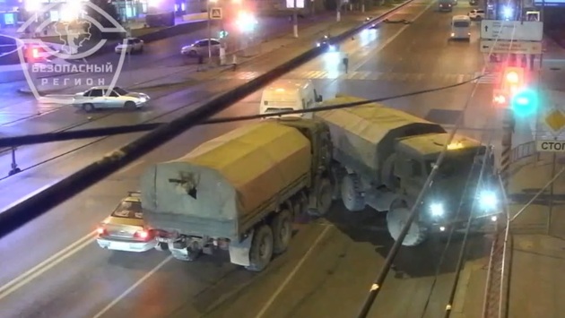 Водитель КАМАЗа уходил от столкновения с маршруткой В Волгограде вчера вечером два военных КАМАЗа стали участниками дорожно-транспортного происшествия. Авария произошла на съезде с Астраханского моста перед перекрестком улиц Рабоче-Крестьянской и Калинина. Сегодня появилось видео ДТП. Судя по записи камер видеонаблюдения, по Рабоче-Крестьянской около 21:00 шла колонна военных КАМАЗов, два первых успели пересечь перекресток на зеленый сигнал светофора, а вот водителю третьего пришлось экстренно тормозить, чтобы не ударить впереди ехавшую маршрутку. КАМАЗ развернуло на 90 градусов, и следом в него влетел другой военный КАМАЗ. видео: РЦУТ По предварительным данным, никто из людей не пострадал. В результате ДТП вдоль дороги было пвреждено ограждение и дорожный знак.
