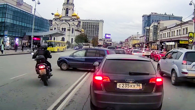 А вот это видео - просто сказка, которая могла случиться только на просторах нашей родины. Действие происходит в Екатеринбурге, где унылые сонные водители стоят в утренней пробке. Внезапно один из автолюбителей, смутьян и бунтарь, решает вырваться на свободу и пересекает двойную сплошную, чтобы поехать обратно. Но в этот момент прямо в бок машине влетает мотоциклист. Но позвольте, откуда же он ехал? Верно, он ехал по встречке, опередив водителя и выехав через двойную сплошную раньше него. Самое смешное в этой ситуации - вызывать ДПС. Однако, судя по ролику, до этого могло и не дойти: мотоциклист в конце явно собирается уехать с места ДТП.
