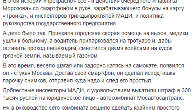 В сообщении отмечается, что пока медики были у больного, водитель «сместился двумя колёсами на кусок грязной земли, называемый газоном», чтобы не мешать пешеходам. Один из прохожих сфотографировал скорую и пожаловался на нарушение.