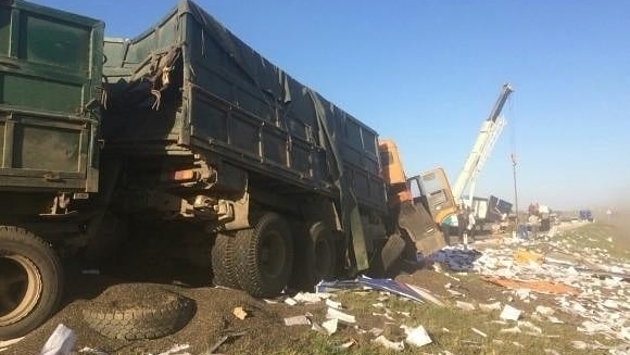 КРАСНОДАР, 11 октября. /ТАСС/. Четыре грузовика попали в ДТП на трассе в Краснодарском крае, в результате два человека погибли, еще один госпитализирован. Об этом сообщили в четверг журналистам в пресс-службе ГУ МВД по региону. Авария произошла на автодороге Краснодар - Кропоткин. "По предварительным данным, водитель грузового автомобиля Iveco выехал на полосу встречного движения и допустил лобовое столкновение с "КамАЗом". От удара Iveco перевернулся и, двигаясь по инерции, столкнулся с грузовым автомобилем Scania, а "КамАЗ" - с другим "КамАЗом", - сообщили в главке. В результате аварии водители двух столкнувшихся автомобилей скончались на месте, водитель второго "КамАЗа" с тяжелыми травмами госпитализирован. На месте происшествия работают сотрудники полиции, устанавливая обстоятельства и причины аварии.