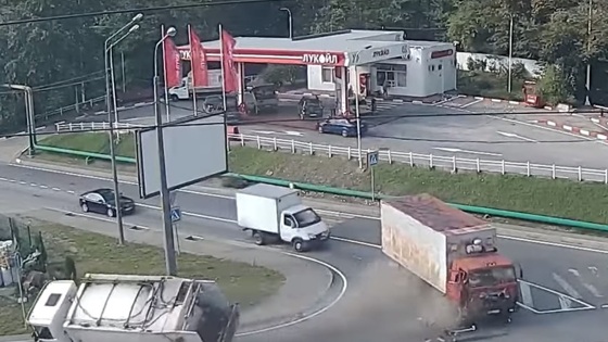 В сети размещены кадры с камеры наблюдения, запечатлевшей момент столкновения двух грузовиков, произошедшего в пятницу, 12 октября, на пересечении улиц Яна Фабрициуса и Транспортной в Сочи. Судя по видео, водитель грузовика "КамАЗ" проигнорировал требование знака и не предоставил преимущество мусоровозу, двигавшемуся по главной дороге. Последний, после столкновения, не устоял на колесах и завалился на бок. О пострадавших в результате ДТП на перекрестке, известном своей аварийностью, пока не сообщалось.