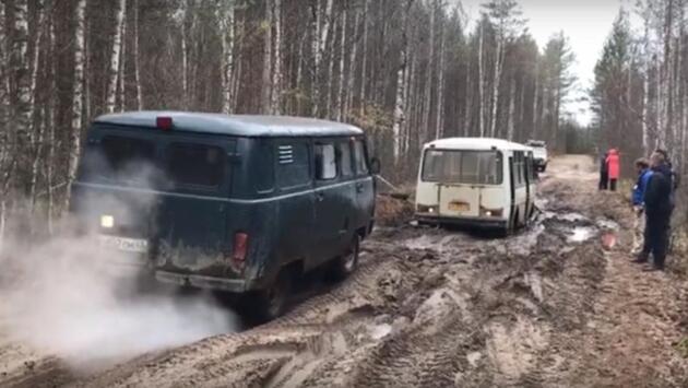 В Кировской области рейсовые автобусы тонут в грязи: «Пазик» пришлось вытаскивать с помощью УАЗа