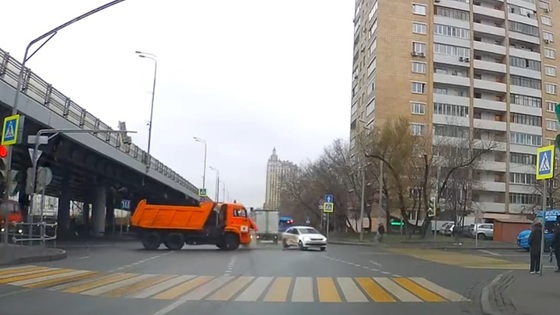 Регистратор запечатлел момент аварии с участием трех транспортных средств, произошедшей в воскресенье, 18 ноября, на пересечении Можайского шоссе, Рябиновой и Гвардейской улиц на западе Москвы. По предварительной информации, водитель легкового автомобиля Volkswagen Polo попытался проехать прямо по ряду, где разрешено только движение налево. Через несколько мгновений после этого легковушка столкнулась с поворачивавшим самосвалом. От удара Volkswagen развернуло и отбросило в сторону, и неуправляемая машина врезалась в маршрутку, стоявшую на светофоре. Как рассказал автор ролика, в результате инцидента пострадала пассажирка Polo.