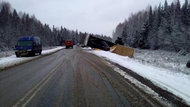 В воскресенье, 18 ноября, около 9 часов утра на на 846-ом километре дороги Кострома – Шарья – Киров – Пермь в Афанасьевском районе столкнулись два грузовика. Об этом сообщили в УГИБДД по Кировской области. По предварительным данным, 51-летний водитель грузовика «Mан» не справился с управлением, выехал на встречную полосу, где столкнулся грузовым автомобилем «Рено Премиум», под управлением 48-летнего водителя. «В результате происшествия водитель первой фуры получил травмы, госпитализация ему не понадобилась», – отметили в ГИБДД. Фото – УГИБДД по Кировской области