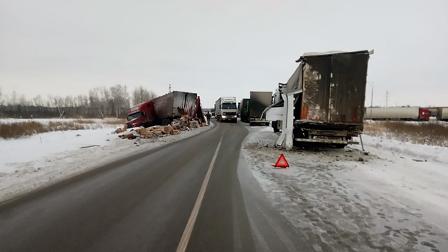 После аварии Сегодня днём в Коченёвском районе Новосибирска одна фура не успела затормозить перед другой фурой и улетела в кювет — груз рассыпался по дороге. Авария случилась неподалёку от станции Дупленская. Большегруз выезжал с автозаправки на трассу и поворачивал в сторону Омска, рассказала корреспонденту НГС инспектор по пропаганде отделения ГИБДД по Коченёвскому району Татьяна Дегтярёва. По её словам, часть автомобилей, которые ехали в это время по трассе притормозили или успели объехать фуру. «Другое транспортное средство — большегруз "Фридлайнер" с прицепом не успел отреагировать, во время притормозить», — уточнила Татьяна Дегтярёва. После того, как «Фридлайнер» резко затормозил, его и прицеп занесло, он сначала въехал в стоящую на обочине фуру «Вольво», а затем съехал в кювет. По дороге разбросало части фуры и её груз. «В одной из фур повредилась различная бытовая техника», — отмечается в группе Новосибирской службы эвакуации АСТ-54 в соцсети «ВКонтакте». В аварии никто не пострадал. Сегодня утром авария с грузовыми автомобилями произошла также на трасс Р-255 «Сибирь» в Мошковском районе — в ГИБДД ищут очевидцев.
