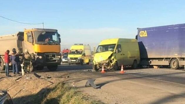 На Окружной в субботу утром столкнулись легковой автомобиль, микроавтобус и две фуры. В результате пострадали четыре водителя, сообщает отдел пропаганды УГИБДД МВД России по региону. Авария произошла в субботу, 1 декабря, в 10:05 на 11-м км северного обхода Калининграда. Mercedes, за рулём которого находился 44-летний автомобилист, двигался со стороны ул. Невского в направлении ул. Горького с превышением скорости и не успел затормозить перед остановившимся Mercedes Sprinter с 30-летним водителем. От удара микроавтобус по инерции проехал вперёд и столкнулся с Volkswagen с 56-летним мужчиной за рулём. Затем Mercedes Sprinter оказался на встречной полосе и врезался в двигавшийся в противоположном направлении Suzuki под управлением 40-летнего автомобилиста. В результате последнее транспортное средство съехало в кювет, а Volkswagen продолжил по инерции двигаться вперёд и столкнулся со стоящим впереди Mercedes, которым управлял 49-летний водитель. ДТП стало причиной двухкилометровой пробки. Фотографии с места массовой аварии опубликовали очевидцы.