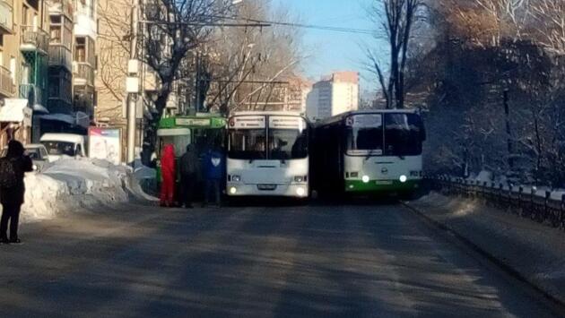 Сегодня днём, 7 декабря, на улице Восход в Октябрьском районе Новосибирска притёрлись два автобуса и один троллейбус, полностью заблокировав движение в сторону Коммунального моста. Авария случилась недалеко от остановки «Восход». Фотографию аварии прислал читатель НГС Егор, уточнив, что видел лишь последствия. На присланной фотографии видно, что два автобуса (№ 5 и № 6) и троллейбус № 8 полностью заблокировали движение по улице Восход. По информации сервиса Яндекс.Пробки, скорость движения по улице Восход в направлении Коммунального моста составляет 5 км/ч. Также затруднено движение по улице Зыряновской и по улице Кирова в направлении Восхода. Сегодня утром на дорогах Новосибирска произошёл десяток аварий — из-за одной из аварий у Академгородка пробка растянулась на 4,5 километра по Бердскому шоссе.